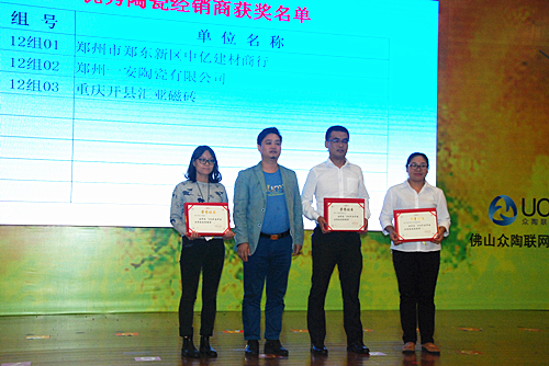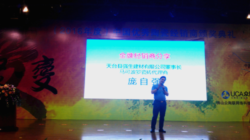 2016年度中國優(yōu)秀陶瓷經(jīng)銷商頒獎典禮在10月19日的下午于瓷海國際陶瓷交易中心五樓會議室隆重舉行。出席此次頒獎典禮的主要嘉賓有:中國陶瓷工業(yè)協(xié)會副理事長浦永祥;中國陶瓷工業(yè)協(xié)會秘書長、營銷分會秘書長 候文全;中國陶瓷工業(yè)協(xié)會副秘書長 樊瑞新;廣東東鵬控股有限公司總裁、佛山眾陶聯(lián)網(wǎng)絡(luò)科技有限公司總裁 蔡初陽;瓷海國際·佛山陶瓷交易中心副總經(jīng)理 林瑩;中國陶瓷工業(yè)協(xié)會營銷分會專職副會長于楓;中國陶瓷工業(yè)協(xié)會營銷分會副會長、廣東陶瓷協(xié)會會長 陳環(huán);中國陶瓷工業(yè)協(xié)會營銷分會副會長、廣東省陶瓷協(xié)會秘書長 陳振廣;中國陶瓷工業(yè)協(xié)會營銷分會副會長、佛山泉州商會會長,香港匯誠集團(tuán)董事長蔡世銓;中國陶瓷工業(yè)協(xié)會營銷分會副會長、南莊鎮(zhèn)公有資產(chǎn)管理辦公室主任 潘大倉;中國陶瓷工業(yè)協(xié)會營銷分會副會長、廣東新明珠集團(tuán)(廣佛)有限公司董事長 唐小梅;中國陶瓷工業(yè)協(xié)會營銷分會副會長、天臺縣強(qiáng)生建材有限公司董事長 龐自強(qiáng);中國陶瓷工業(yè)協(xié)會營銷分會副會長、佛山市格里菲斯建材有限公司總經(jīng)理 羅新家;中國陶瓷工業(yè)協(xié)會營銷分會常務(wù)副秘書長 姜崇;肇慶大將軍陶瓷有限公司董事長柳朝陽;廣東新明珠陶瓷集團(tuán)有限公司營銷總經(jīng)理 彭新峰等相關(guān)領(lǐng)導(dǎo)及各地經(jīng)銷商代表。
